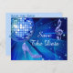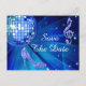Cartes postales "Save the Date" élégantes et glamour pour un 60e anniversaire. Cartes "Save the Date" tendance avec paillettes et glamour pour vos célébrations d'anniversaire de 60 ans. Belle image de notes de musique, de diamants scintillants bleus et argentés, de bijoux clinquants, de boule à facettes disco rétro funky bleue et de chaussure à talon haut style stiletto pailletée bleue et argentée sur un fond bleu chic. Une carte postale "Save the Date" mignonne, classe, élégante et jolie pour les fêtes d'anniversaire des femmes. Les femmes adoreront ce design cool, amusant, funky et féminin pour leurs fêtes glamour de musique et de danse. Si vous avez besoin d'aide pour personnaliser votre produit, veuillez me contacter via ma boutique et je ser