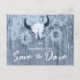 Cette douce rustique bleu roux western boho tournesol Save The Date cartes postales sont une merveilleuse façon d'informer vos invités de votre jour de mariage. Crâne de taureau rodéo cowboy avec cornes texture florale pays, bois grange bohème vintage, style cowgirl de ferme. Recherchez les produits correspondants dans cette collection. Copyright de l'image Marg Seregelyi Photography.