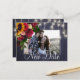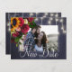 Tournures de tournesols dorés, roses rouges burgundy, cordes de lumières scintillantes et écriture typographique blanche sur fond bleu marine sombre élégant tableau photo nouvelle date reportée carte de faire-part de mariage. +++++++++ Facile à personnaliser avec vos noms et texte ! ++++++++++ Convient pour les mariages floraux d'hiver, de Noël, de fin d'été ou d'automne / jardin arrière-cour rustique ou à la ferme.