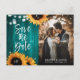 Mariage turquoise rustique enregistrer la date photo cartes postales avec tournesol et lumières à cordes sur un arrière - plan en bois de grange. Conception de carte idéale pour une fête de mariage rustique turquoise inspirée des tournesols.