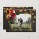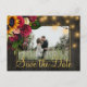 Tournesols jaune or, roses rouge burgundy, et guirlandes de lumières scintillantes sur fond de bois de grange élégant brun foncé, carte de postale de mariage pour annoncer la date. +++++++++ Facile à personnaliser avec vos noms et texte ! ++++++++++ Convient aux mariages floraux d'été ou d'automne / jardin arrière-cour rustique ou campagne ou ferme décorée.