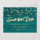Mariage en bois rustique turquoise sur mesure enregistrer les cartes postales datées avec un arrière - plan en bois rustique orné de lampes à cordes. Personnalisez facilement cette rustique enregistrer la carte postale de date avec vos détails mariages. Pour des demandes personnalisées, envoyez-nous un message.