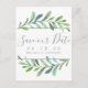 Un mariage botanique élégant sauvez la date carte postale bordée de vignes bleu-vert aquarelle. La couleur arrière - plan est affichée en blanc, mais peut être customisée pour correspondre à votre thème mariage.