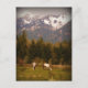 Une belle carte postale avec une scène paysagère de deux chevaux blancs broutant dans un pâturage de vallée à la base de montagnes enneigées.