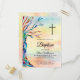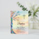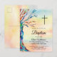 Famille Invitation et amis au baptême de votre bébé avec cette invitation unique de carte postale. Il dispose d'un arbre généalogique aux couleurs de l'arc-en-ciel et d'une croix sur un arrière - plan aquarelle. Facilement personnalisable avec vos détails. Ce design unique est l'impression d'une mosaïque d'arbre généalogique qui a été faite à partir de minuscules morceaux de verre aux couleurs vives. Parce que nous créons notre propre oeuvre, vous ne trouverez pas cette image exacte d'autres designers. Mosaïque originale © Michele Davies.