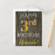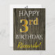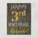 Ce design simple et personnalisé de carte postale d'anniversaire comporte le message "HAPPY 3rd BIRTHDAY", avec le "3rd" ayant une apparence fausse or. L'avant est également orné d'un nom personnalisé et d'un arrière - plan à l'allure imitation bois. Le dos contient un message d'anniversaire personnalisé, ainsi que l'adresse personnalisable du destinataire de la carte postale d'anniversaire. On pourrait le donner à quelqu'un qui célèbre son troisième anniversaire. [~Z0000066]