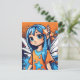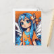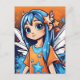 Carte postale mignonne avec un design numérique d'une jolie fille fée orange et bleue avec de grands yeux bleus et de longs cheveux bleus. Elle est entourée de nombreuses étoiles bleues et orange et de projections bleues qui lui donnent un aspect graffiti.