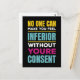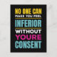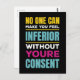 Cette carte postale noire frappante comporte le message habilitant "PERSONNE NE PEUT VOUS FAIRE SENTIR INFÉRIEUR SANS VOTRE CONSENTEMENT", magnifiquement affiché dans un mélange de typographie jaune, bleu clair, blanc et rose. Les couleurs vives renforcent cette affirmation, ce qui en fait un rappel inspirant du pouvoir personnel et de l'estime de soi. Que vous l'envoyiez à un ami ou que vous le gardiez comme un mantra personnel, cette carte postale sert d'affirmation audacieuse de la confiance et de l'égalité. Parfait pour ceux qui soutiennent le féminisme, les droits des femmes et les valeurs pro-choix, cette carte postale est une puissante déclaration pour la santé des femmes et la lutte continue pour l'autonomie corporelle. Présentez-le fièrement comme un hommage à l'égalité des femmes et comme un rappel constant que personne n'a le droit de diminuer votre valeur.
