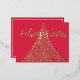 Le design Felices Fiestas Script Holiday Postcard présente un arbre avec des flocons d'or, l'image présente un design or et rouge simple mais élégant qui peut être utilisé par n'importe qui pendant la saison des fêtes.