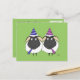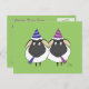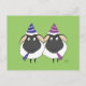 Carte postale montrant deux adorables moutons en casquettes de fête avec des cornes. Sur le dos de la carte postale, on peut lire : "Voici deux éwe Félicitations !". L'Arrière - plan est affiché en vert, mais il et la police et la phrase peuvent facilement être customisés à ce que vous voulez.