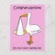 Une cigogne de dessin animé tenant un bébé dans un drap, qui est accroché à son bec. L'image a un arrière - plan rose pâle et est accompagnée par les mots "Félicitations pour le jour du nom de votre bébé".