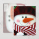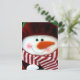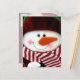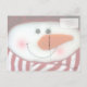 Une photo d'une carte postale de vacances en bonhomme de neige feutrée. Le bonhomme de neige porte un foulard rayé rouge et blanc et un casquette rouge. Le nez de carotte orange est là aussi, avec un peu de rougissement sur les joues.