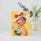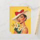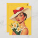Une femme glamour dans un casquette blanc avec un arc rouge, tenant un bouquet de jonquilles jaunes et blanches contre un arrière - plan jaune vif.