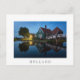Photo carte postale d'une maison traditionnelle en bois utilisée comme fromagerie en peinture verte avec carreaux rouges avec réflexion dans l'eau au début de la nuit au crépuscule au musée Zaanse Schans en Hollande avec une bordure blanche et le texte 'Holland'.
