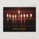 Cette carte postale célèbre le Festival des lumières, aussi connu sous le nom d'Hanoukka, Chanukah, Chanukkah, Chanuka, ou fête de la dédicace. Il s'agit d'une fête juive de huit jours commémorant la réinauguration du Temple Saint (le Second Temple) à Jérusalem par Judas Maccabee à l'époque de la Révolution Maccabéenne. Le festival est observé par l'allumage des bougies d'un candélabre unique, les neuf branches Menorah ou Hanukiah, une bougie supplémentaire chaque nuit de la fête, progressant à huit sur la dernière nuit. La lumière supplémentaire est appelée un shamash dont le but est d'avoir une lumière disponible à l'utilisation, car l'utilisation des lumières Hanoukka elles-mêmes est interdite.
