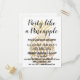 Fête comme un ananas Tropical Destination Anniversaire Carte postale Invitation. C'est une invitation parfaite pour un anniversaire à thème ananas. L'ananas est un faux papier doré avec un script texte écrit à la main superposé sur le dessus. Le texte peut être customisé avec vos informations.