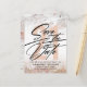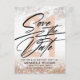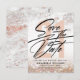 Carte postale moderne et tendance pour les 21 ans Enregistrer La Date. La conception comprend le numéro 21 en or rose sur un fond de marbre or rose et de paillettes, la typographie script ''enregistrer la date'' et les détails en lettres grasses.