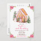 Cette invitation d'anniversaire élégante et festive présente une maison en pain d'épices aquarelle et de belles fleurs de poinsettia roses. Le texte combine une écriture manuscrite et des polices sans serif pour un look stylé et moderne. Le bonhomme de neige, les sapins décorés et la couronne de Noël ajoutent une touche festive. C'est parfait pour les fêtes d'anniversaire de Noël.