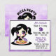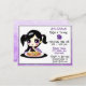 Cartes d'invitation d'anniversaire de fête de pizza de fille. Fille animée violette et noire avec assiette de pizza.