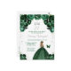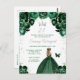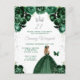 Cette invitation de fête d'anniversaire élégante et glamour présente une belle princesse aux cheveux blonds dans une robe de bal vert foncé. Le texte combine une écriture manuscrite et des polices modernes sans serif pour un look classe et sophistiqué. Les arrangements floraux, le papillon et les confettis argentés créent le mélange parfait de rustique et de chic.