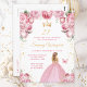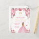 Cette invitation de fête d'anniversaire élégante et glamour présente une belle princesse aux cheveux blonds dans une robe de bal rose pastel. Le texte combine une écriture manuscrite et des polices modernes sans empattement pour un look classe et sophistiqué. Les arrangements floraux, le papillon et les confettis dorés créent le mélange parfait de rustique et de chic.