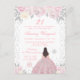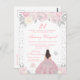 Cette invitation d'anniversaire d'hiver élégante et glamour présente une belle princesse aux cheveux bruns et à la peau claire dans une robe de bal rose. Le texte combine une écriture manuscrite et des polices modernes sans serif pour un look classe et sophistiqué. Les arrangements floraux, les flocons de neige et les confettis argentés créent le mélange parfait de rustique et de chic.