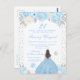 Cette invitation d'anniversaire d'hiver élégante et glamour présente une belle princesse aux cheveux bruns et à la peau claire dans une robe de bal bleue. Le texte combine une écriture manuscrite et des polices sans serif modernes pour un look classe et sophistiqué. Les arrangements floraux, les flocons de neige et les confettis argentés créent le mélange parfait de rustique et de chic.