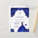 Cette invitation de fête d'anniversaire élégante et glamour présente une belle princesse aux cheveux bruns dans une robe de bal bleu foncé. Le texte combine une écriture manuscrite et des polices sans serif modernes pour un look classe et sophistiqué. Les arrangements floraux, le papillon et les confettis argentés créent le mélange parfait de rustique et de chic.
