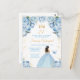 Cette invitation de fête d'anniversaire élégante et glamour présente une belle princesse à peau noire portant une robe de bal bleu clair. Le texte combine une écriture manuscrite et des polices modernes sans serif pour un look classe et sophistiqué. Les arrangements floraux, le papillon et les confettis dorés créent le mélange parfait de rustique et de chic.