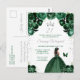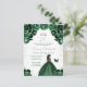 Cette invitation d'anniversaire élégante et glamour présente une belle princesse à peau noire portant une robe de bal vert foncé. Le texte combine une écriture manuscrite et des polices modernes sans serif pour un look classe et sophistiqué. Les arrangements floraux, le papillon et les confettis argentés créent le mélange parfait de rustique et de chic.