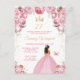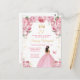Cette invitation d'anniversaire élégante et glamour présente une belle princesse à peau noire dans une robe de bal rose pâle. Le texte combine une écriture manuscrite et des polices modernes sans serif pour un look classe et sophistiqué. Les arrangements floraux, le papillon et les confettis dorés créent le mélange parfait de rustique et de chic.