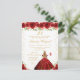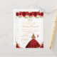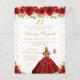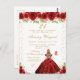 Cette invitation d'anniversaire élégante et glamour présente une belle princesse aux cheveux blonds et à la peau claire dans une robe rouge à ballerine. Le texte combine une écriture manuscrite et des polices modernes sans serif pour un look classe et sophistiqué. Les arrangements floraux, les papillons et les confettis dorés créent le mélange parfait de rustique et de chic.