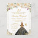 Cette invitation élégante et glamour pour une fête d'anniversaire présente une belle princesse aux cheveux blonds et à la peau claire dans une robe noire de bal. Le texte combine une écriture manuscrite et des polices modernes sans serif pour un look classe et sophistiqué. Les arrangements floraux, les papillons et les confettis dorés créent le mélange parfait de rustique et de chic.