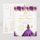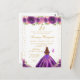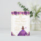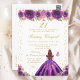 Cette invitation de fête d'anniversaire élégante et glamour présente une belle princesse aux cheveux brun-roux et à la peau claire dans une robe de bal violette foncée. Le texte combine une écriture manuscrite et des polices modernes sans empattement pour un look classe et sophistiqué. Les arrangements floraux, les papillons et les confettis dorés créent le mélange parfait de rustique et de chic.