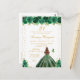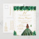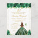Cette invitation de fête d'anniversaire élégante et glamour présente une belle princesse aux cheveux roux bruns et à la peau claire dans une robe de bal verte. Le texte combine une écriture manuscrite et des polices modernes sans serif pour un look classe et sophistiqué. Les arrangements floraux, les papillons et les confettis dorés créent le mélange parfait de rustique et de chic.