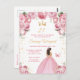Cette invitation de fête d'anniversaire élégante et glamour présente une belle princesse aux cheveux bruns dans une robe de bal rose pastel. Le texte combine une écriture manuscrite et des polices modernes sans serif pour un look classe et sophistiqué. Les arrangements floraux, le papillon et les confettis dorés créent le parfait mélange de rustique et de chic.