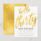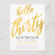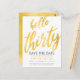 Conception élégante de carte postale "Sauvegarder la date" pour un 30e anniversaire avec une grande typographie en or et texte personnalisé.