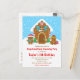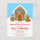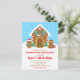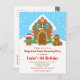 Cette invitation d'anniversaire mignonne et festive présente une jolie maison en pain d'épices décorée de bonbons rouges et verts. À côté se trouvent des bonshommes en pain d'épices adorables avec des cadeaux, habillés de chapeaux et d'une écharpe de Père Noël. En arrière-plan, un ciel d'hiver bleu vif avec des flocons de neige élégants qui tombent. Le texte combine des polices décoratives et sans empattement pour un look stylé et moderne. C'est parfait pour une fête de décoration de maison en pain d'épices de Noël.