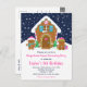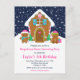 Cette invitation d'anniversaire mignonne et festive présente une charmante maison en pain d'épices décorée de bonbons roses et verts. À côté se trouvent des bonshommes en pain d'épices adorables avec des cadeaux, vêtus de chapeaux et d'écharpes de Père Noël. En arrière-plan, un ciel hivernal bleu marine avec des flocons de neige élégants qui tombent. Le texte combine des polices décoratives et sans empattement pour un look stylé et moderne. C'est parfait pour une fête de décoration de maison en pain d'épices de Noël.