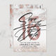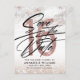 Carte postale moderne et tendance de Save The Date pour un anniversaire Sweet 16. Le design présente le numéro 16 en rose gold sur un fond en marbre rose gold et paillettes, avec la typographie script ''save the date'' et les détails en caractères gras.