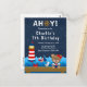 Cette invitation mignonne et amusante présente un ours de marin nautique sur un pont en bois avec une mouette et un crabe. En arrière-plan, il y a un phare rouge et blanc, un oiseau mignon sur un voilier, des vagues océaniques et un ciel nocturne étoilé bleu marine. Le texte combine des polices grasses et serif pour un look stylé et moderne. C'est parfait pour une fête d'anniversaire sur le thème nautique.