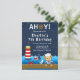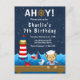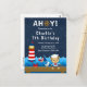 Cette invitation mignonne et amusante présente un singe garçon marin sur un pont en bois avec une mouette et un crabe. En arrière-plan, il y a un phare rouge et blanc, un oiseau mignon sur un voilier, des vagues océaniques et un ciel nocturne étoilé bleu marine. Le texte combine des polices grasses et serif pour un look stylé et moderne. C'est parfait pour une fête d'anniversaire sur le thème marin.