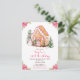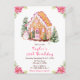 Cette invitation d'anniversaire élégante et festive présente une maison en pain d'épices aquarelle et de belles fleurs de poinsettia roses. Le texte combine une écriture manuscrite et des polices sans serif pour un look stylé et moderne. Le bonhomme de neige, les sapins décorés et la couronne de Noël ajoutent une touche festive. C'est parfait pour les fêtes d'anniversaire de Noël.