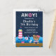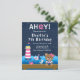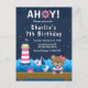 Cette invitation mignonne et amusante présente un ours fille de marin nautique sur un pont en bois avec une mouette et un crabe. En arrière-plan, il y a un phare rose et blanc, un oiseau mignon sur un voilier, des vagues océaniques et un ciel nocturne étoilé bleu marine. Le texte combine des polices grasses et serif pour un look stylé et moderne. C'est parfait pour une fête d'anniversaire sur le thème nautique.