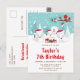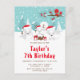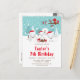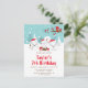 Cette invitation d'anniversaire mignonne et amusante présente une adorable famille de renards arctiques dans un cadre de pays des merveilles hivernal avec des arbres enneigés et un oiseau rouge sur une branche avec du houx. Les renards avec des chapeaux de Père Noël ajoutent une touche festive. En arrière-plan, on voit un ciel bleu-vert sarcelle et des flocons de neige qui tombent. Le texte combine des polices décoratives et sans empattement pour un look stylé et moderne. C'est parfait pour un anniversaire sur le thème de Noël.