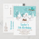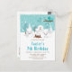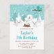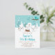 Cette invitation d'anniversaire mignonne et amusante présente une famille de renards arctiques adorable dans un cadre de merveilleux hiver avec des arbres enneigés et un oiseau bleu sur une branche avec du houx. En arrière-plan, on voit un ciel bleu-vert et des flocons de neige qui tombent. Le texte combine des polices décoratives et sans serif pour un look stylé et moderne. C'est parfait pour un anniversaire sur le thème de Noël ou de l'hiver.