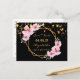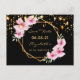 A Enregistrer la carte de date pour un tropical sous le thème des étoiles 50ème anniversaire (ou tout âge) fête. Devant : Style tropical tendance. Avec un cadre géométrique en faux or décoré d'hibiscus roses, fleurit des fleurs tropicales avec un peu de verdure. Un arrière - plan noir chic et des étoiles dorées. Modèles pour un nom et une date. Lettres d'or. Le nom et le texte : Save the Date sont écrits avec un script de style manuscrit moderne. Dos : pas de couleur arrière - plan, des lettres noires.