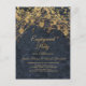 Invitation de fête de fiançailles élégante avec guirlande dorée scintillante et bokeh bleu marine.