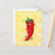 Un personnage de dessin animé de poivron rouge et chaud. Création originale avec un motif de dentelle dorée (imprimé jaune) en arrière-plan.