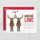 Orignal fantaisiste mignon disant "ça doit être l'amour". Ce design présente des invitations drôles et amusantes pour les fiançailles, parfaites pour la célébration du couple marié, une réunion de célébration, un cœur d'animal d'orignal humoristique, une citation "ça doit être l'amour", une typographie créative et cool, un style moderne et élégant, un couple marié, une illustration graphique de dessin animé rouge avec des cœurs, une carte postale de fiançailles à petit budget